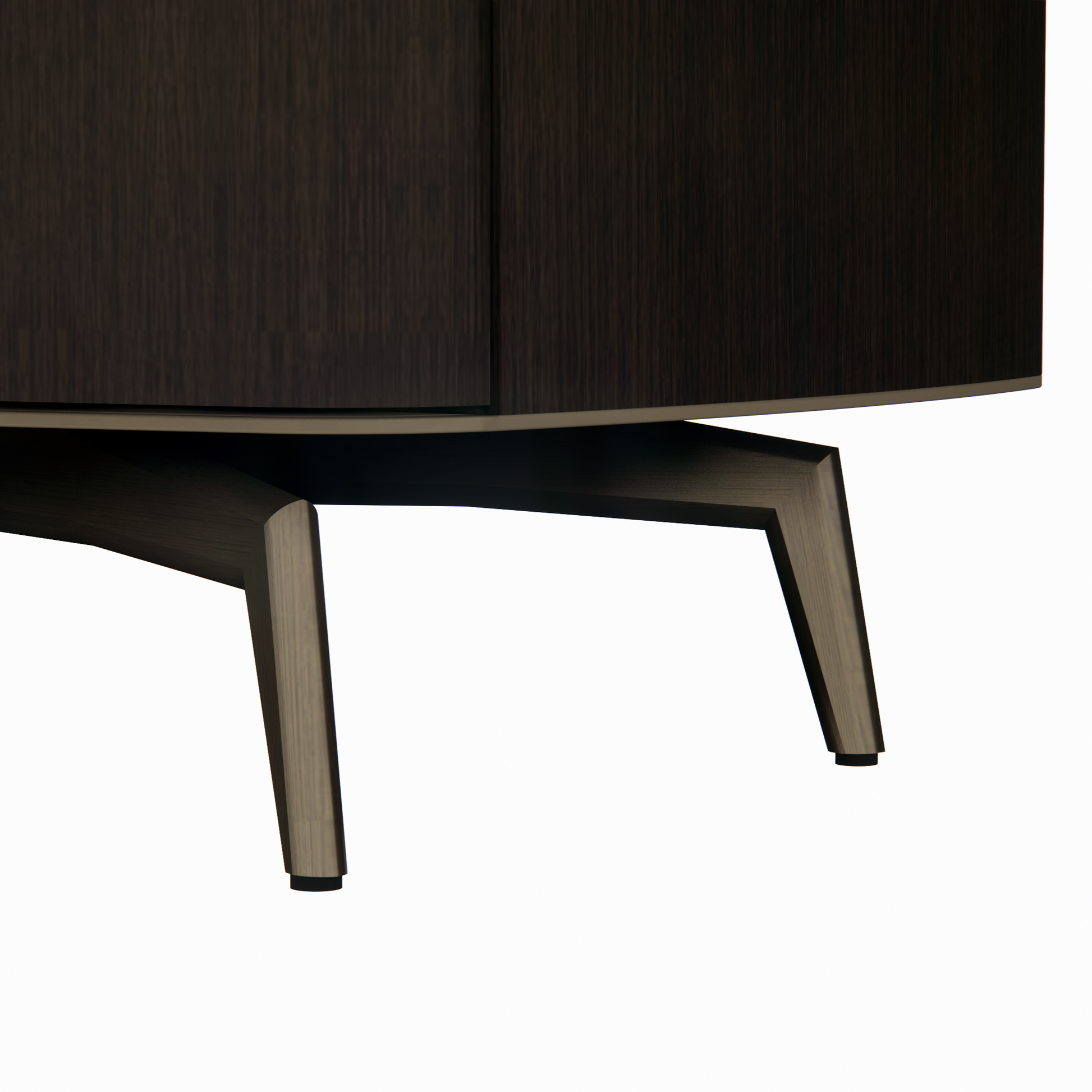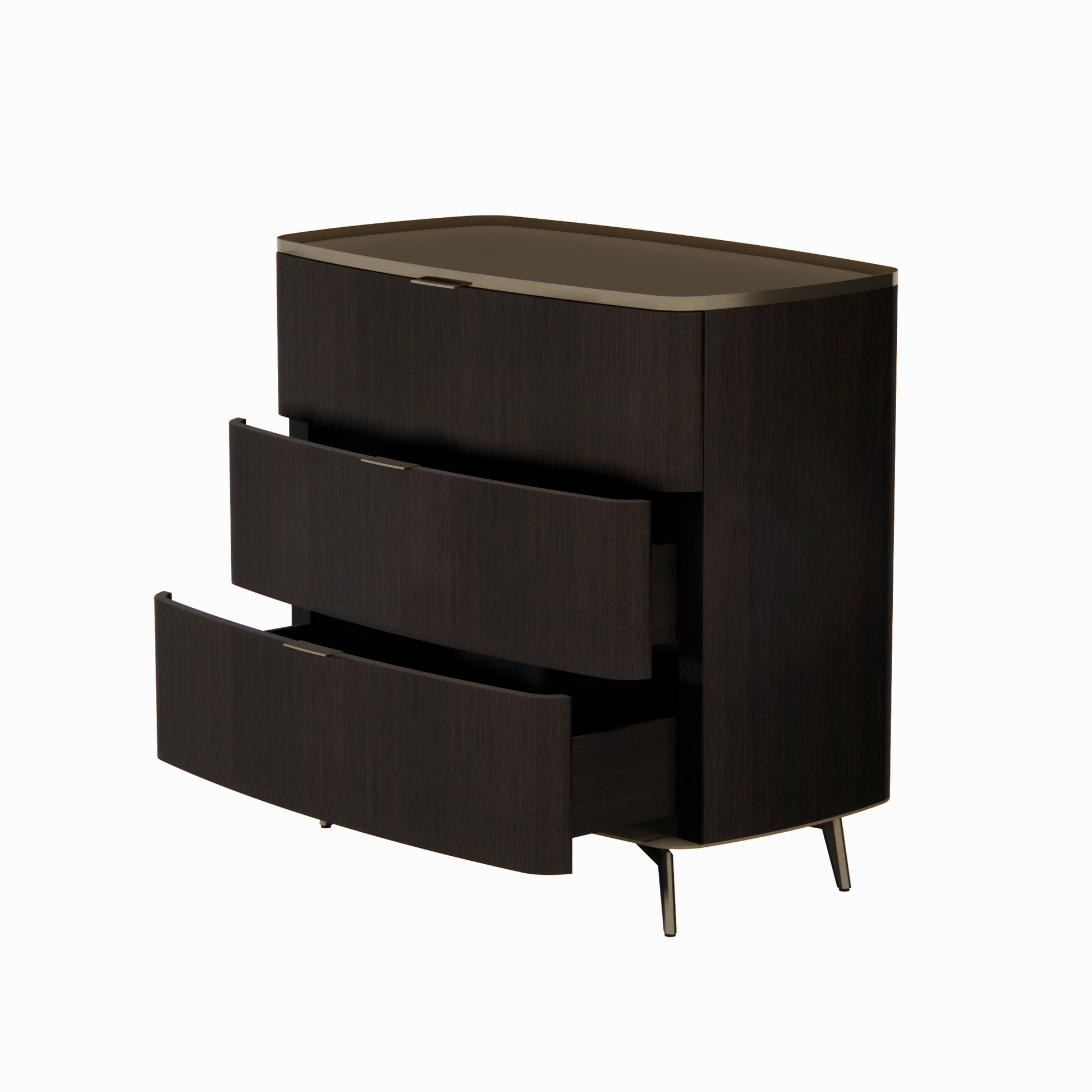 The Vermont Dresser features three slightly recessed drawers with a stainless steel hairline in gold-bronze paint with a polyurethane finish. The dark stained, solid wood-oak open grain drawers move smoothly with soft closing, blum double extensions. The legs feature molded hairline stainless steel with gold-bronze paint and a polyurethane finish, allowing this dresser to stand out as a statement piece.